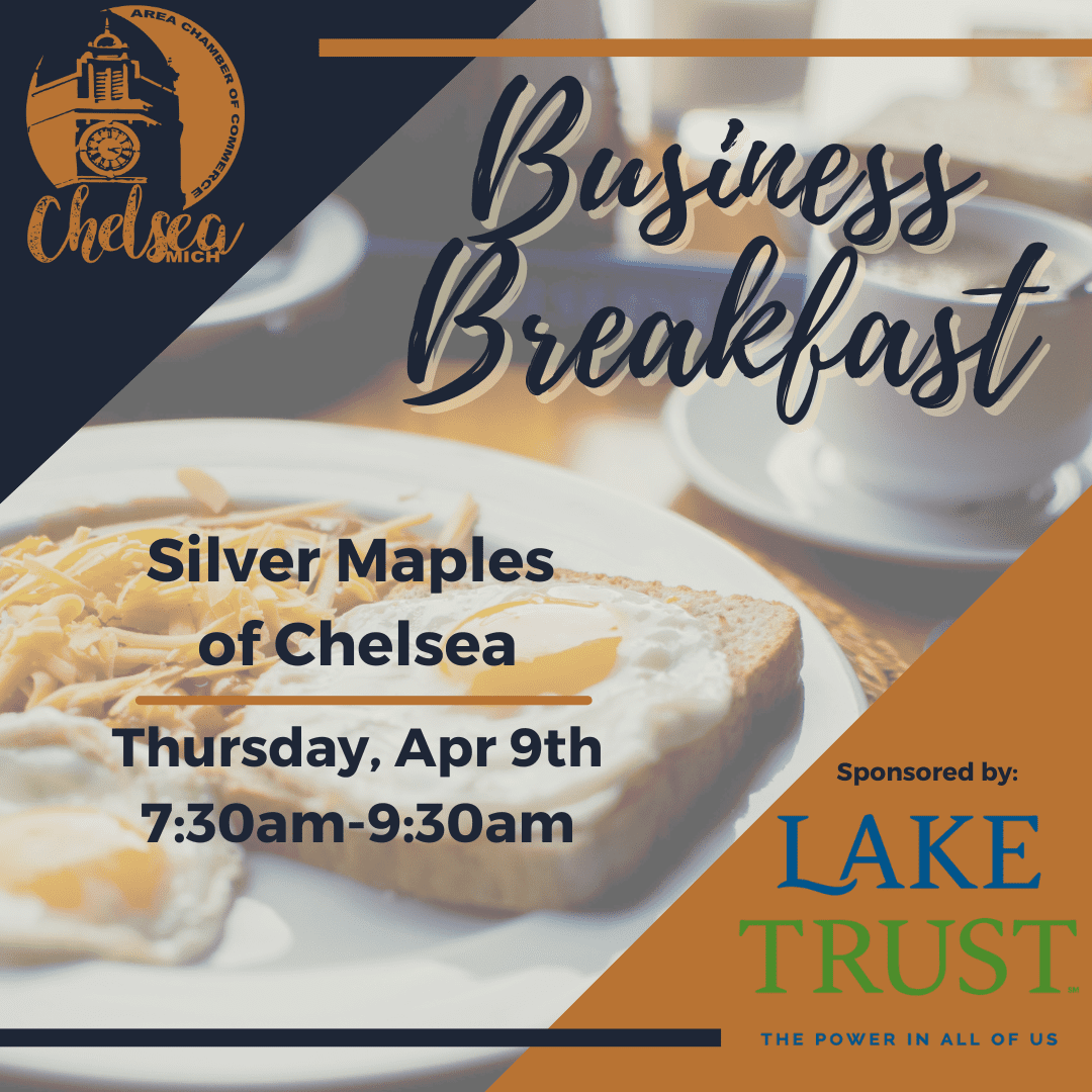 Join us for the 2nd quarter Chelsea Area Chamber of Commerce Business Breakfast! This is a great opportunity to network with the rest of the Chamber while enjoying a delightful breakfast from Silver Maples of Chelsea. Cost is $15($25 for Non-Chamber Members) and includes breakfast which will be served at 7:30 A.M. Thank you to our sponsor: Lake Trust Credit Union
