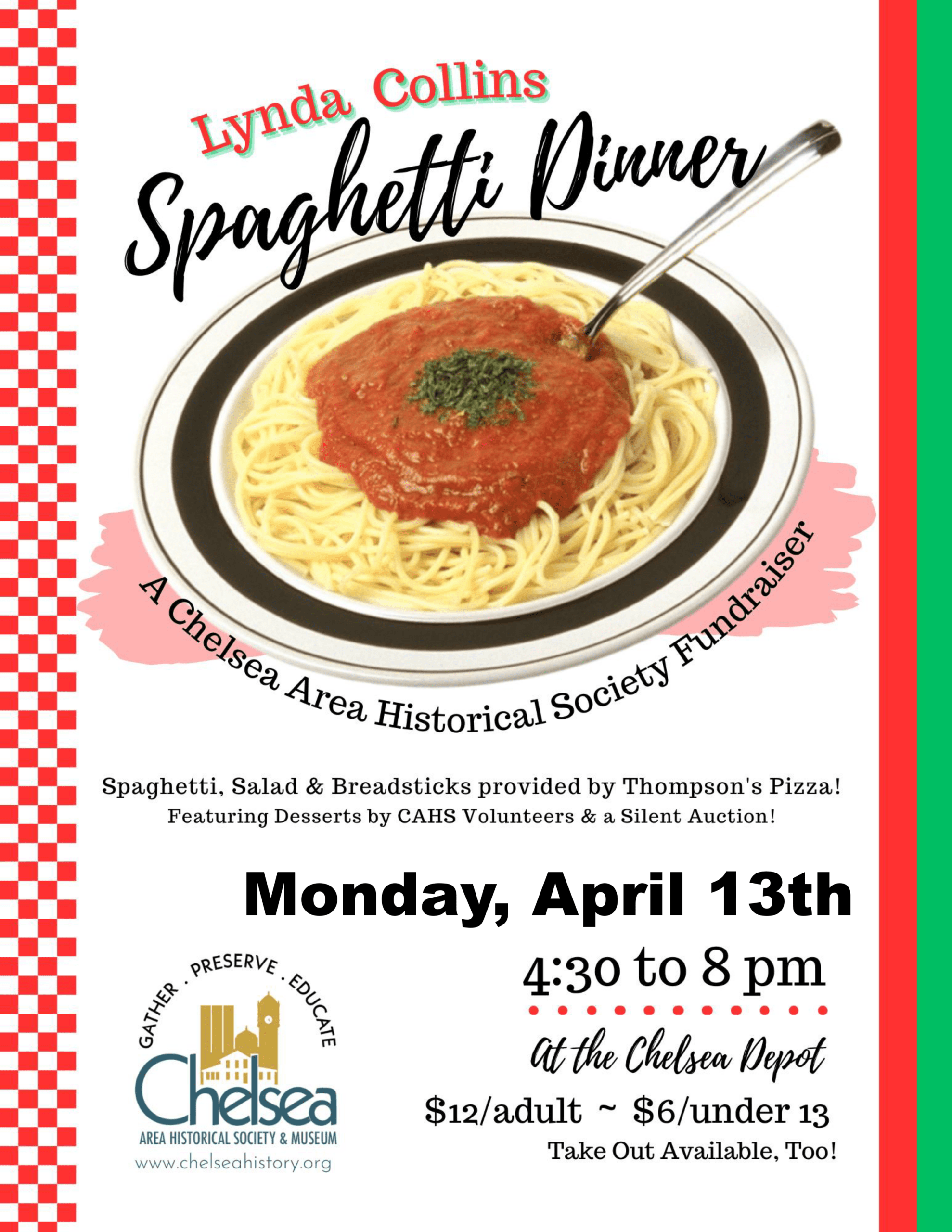 Spring is on the way and a great sign of it is the Chelsea Area Historical Society’s annual Lynda Collins Spaghetti Dinner at the historic Chelsea Train Depot, 125 Jackson St, Chelsea MI – Monday, April 13th from 4:30 to 8:00. Our thanks to Lynda’s family at Thompson’s Pizza for their generous donation of the wonderful food we’ll have available that evening! The meal includes their famous spaghetti and sauce, breadsticks, and salad. We’ll also have a homemade dessert fresh baked by CAHS volunteers.