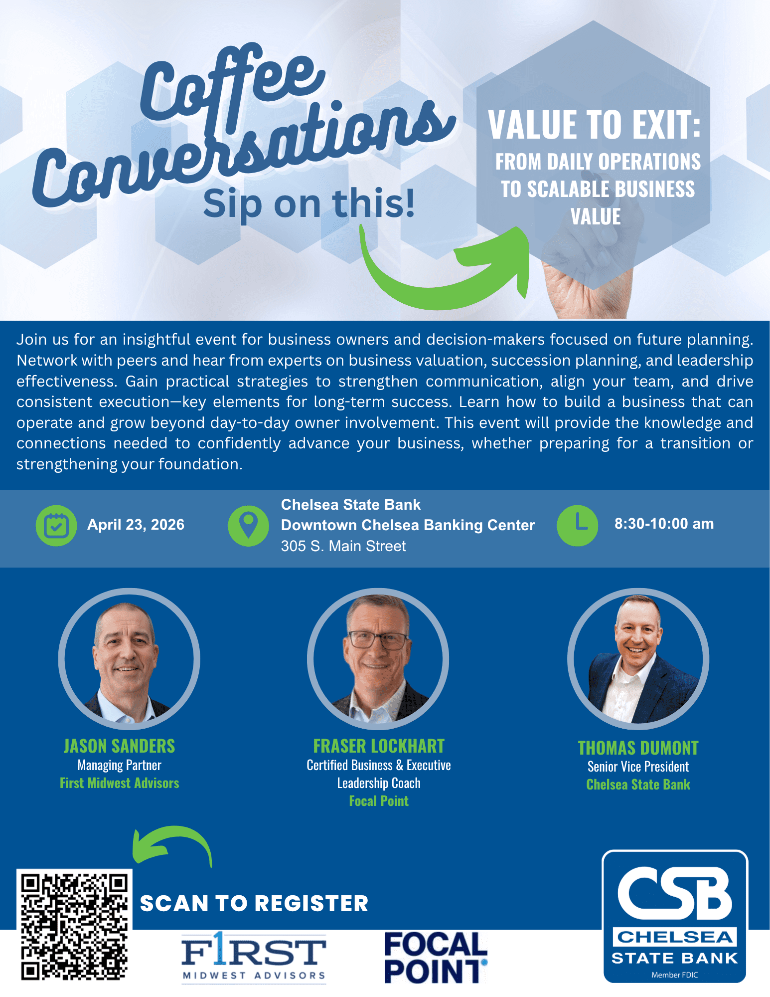 Join us for an insightful event for business owners and decision-makers focused on future planning. Network with peers and hear from experts on business valuation, succession planning, and leadership effectiveness. Gain practical strategies to strengthen communication, align your team, and drive consistent execution—key elements for long-term success. Learn how to build a business that can operate and grow beyond day-to-day owner involvement. This event will provide the knowledge and connections needed to confidently advance your business, whether preparing for a transition or strengthening your foundation.