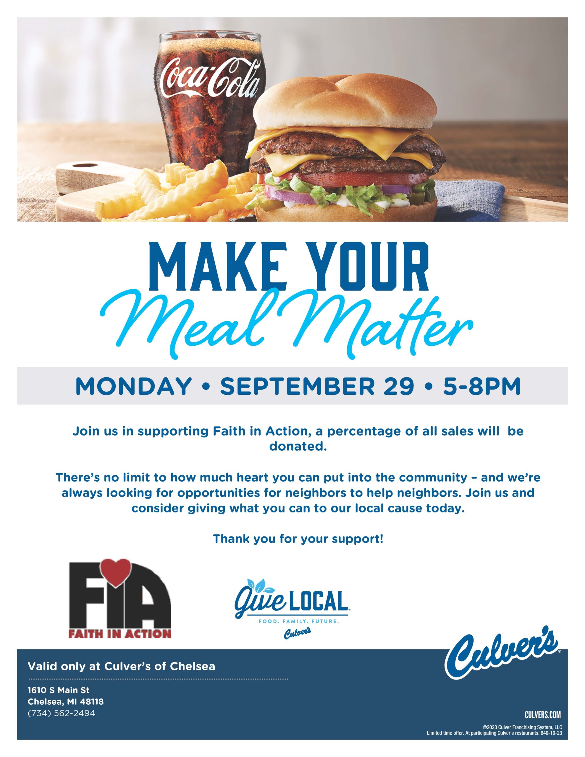 Come in and enjoy a great meal while supporting a great cause!  On Monday, September 29 from 5pm to 8pm, Culver’s of Chelsea will be donating a percentage of all sales to Faith in Action.