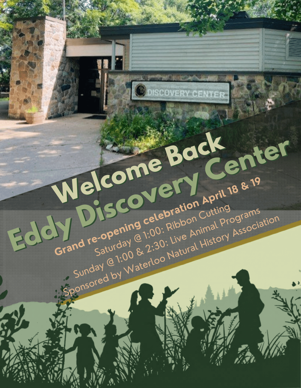 Come in to see the new and improved Discovery Center and enjoy some family-friendly activities which will include a ribbon cutting ceremony at 1:00 p.m. on Saturday and live animal programs on Sunday afternoon at 1:00 and 2:30 pm, sponsored by the Waterloo Natural History Association. We will also be celebrating Earth Day with special earth and nature-themed activities.