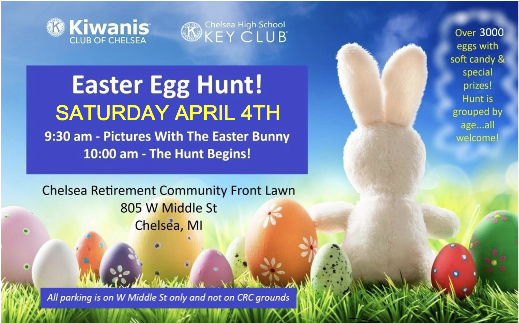 Come meet the Easter Bunny and join in the annual Kiwanis/Key Club Easter Egg Hunt hosted at the Chelsea Retirement Center! The event starts at 9:30 am to meet and get pictures with the Easter Bunny, then the hunt begins promptly at 10:00 am. Over 3000 eggs with soft candy and special prizes! Hunt is grouped by age…all are welcome!