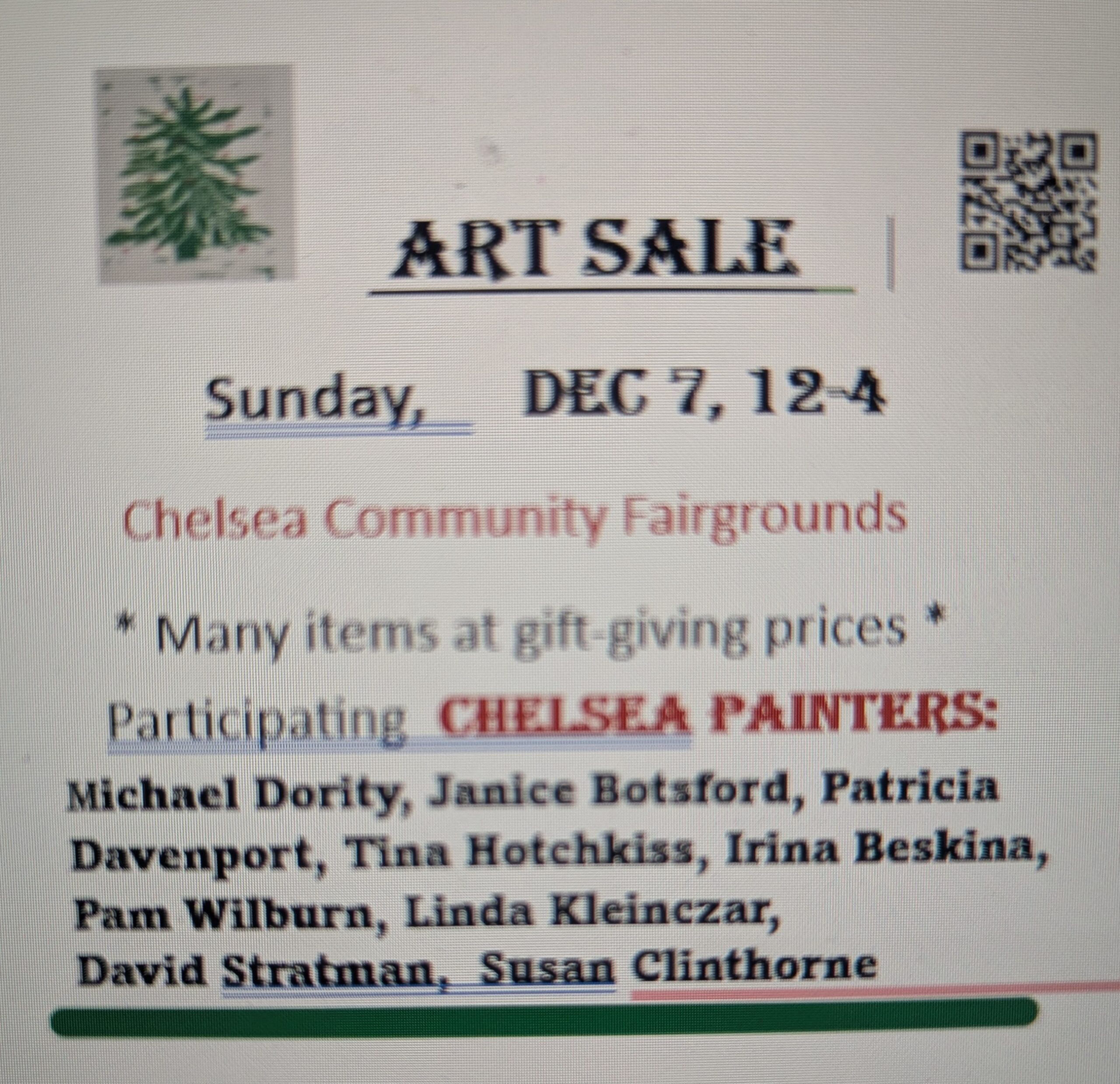 Dec 7 12-4 in the Chelsea Community Fairgrounds Service Center. Many Chelsea Painters- fine artists will have art for sale at gift giving prices.